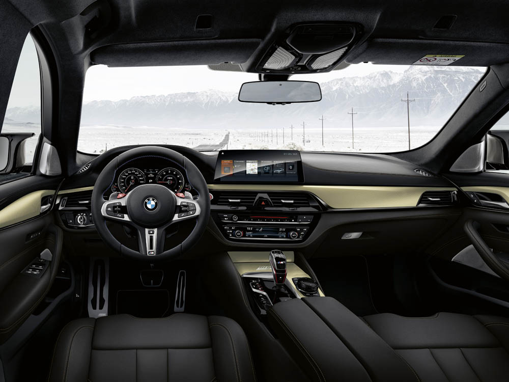 En el interior BMW ha tapizado los asientos M multifuncionales en cuero Merino negro con beige en contraste. Además las molduras de fibra de carbono del interior van en color dorado, usado por primera vez en un modelo de la marca, y decorando el salpicadero, la consola central y los pasos de las puertas. Aquí precisamente estas placas lucen el nombre de la edición «M5 Edition 35 Jahre 1/350» con las letras iluminadas, y cada unidad llevará una placa numerada en la consola central. El M5 Edición 35 aniversario llegará en julio a los concesionarios y el precio no se ha anunciado, pero costará más que un M5 Competition cuya tarifa son 136.700 euros.