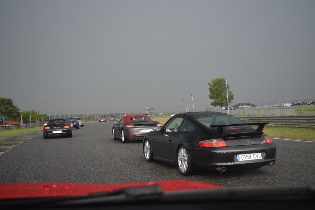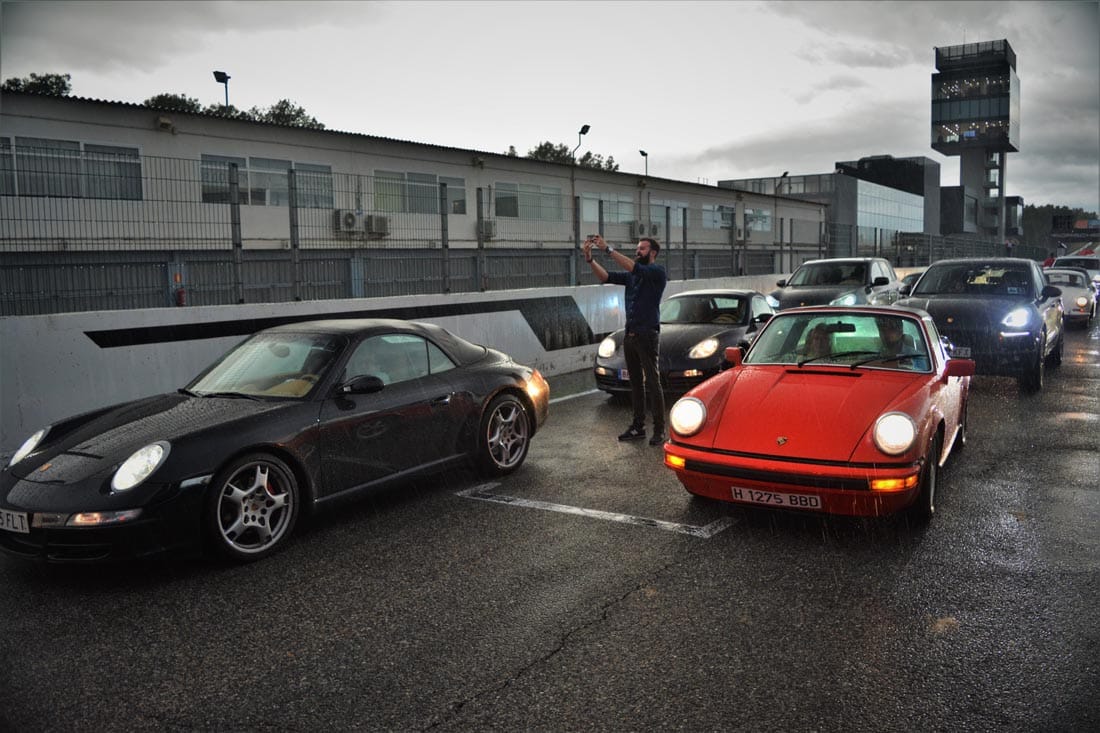 Para salir a pista, un Macan GTS nos haría las veces de coche cámara. Sin embargo, la lluvia quiso sumarse a la fiesta y acabó siendo uno más en el desfile. A pesar del chaparrón fueron muchos los aficionados que con sus Porsche se quedaron hasta el final para la gran foto de familia. Pasábamos las curvas de Le Mans, Varzi y la subida de Pegaso y mirabas por el retrovisor y ahí estaba la caravana de Porsche, bajo un aguacero digno de una tormenta tropical.