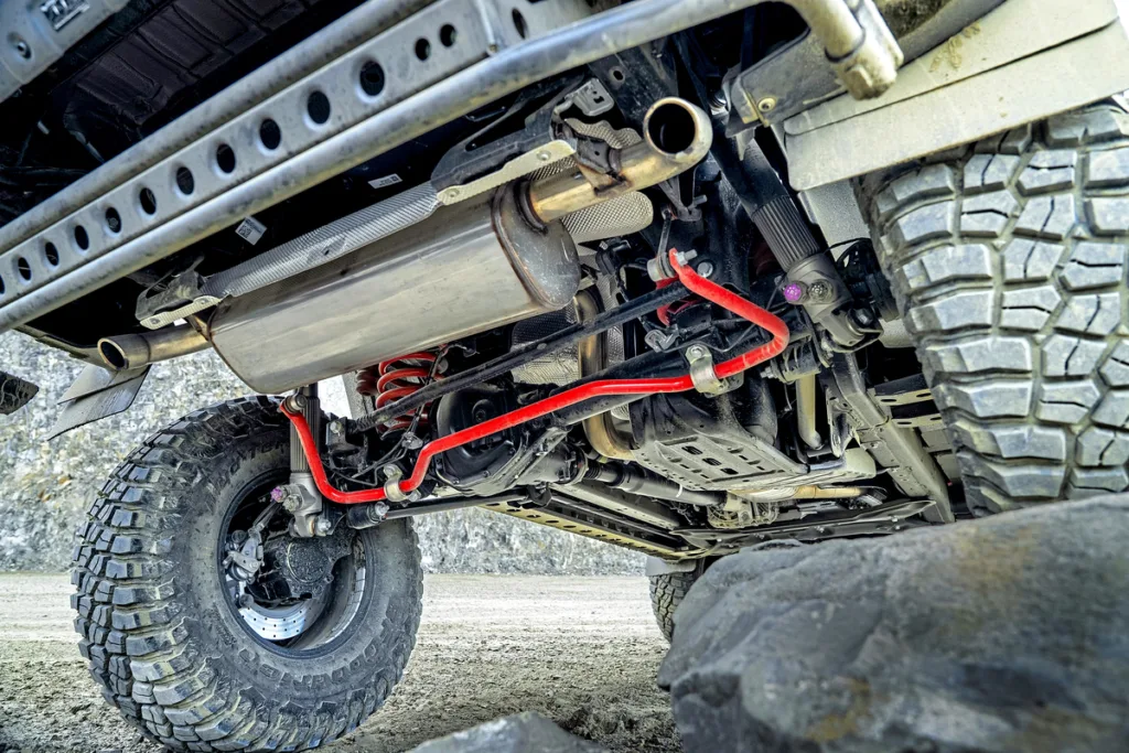 Los pórticos montados en los extremos de los ejes rígidos delanteros y traseros ensanchan enormemente la vía, lo que obliga a montar extensiones de los pasos de rueda que cubren unos enormes neumáticos BFGoodrich Mud-Terrain de 37 pulgadas.