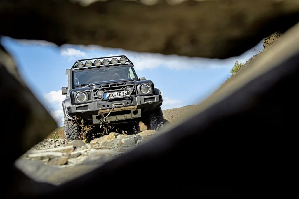 Pero incluso ellos se quedarían bloqueados por algunos de estos pedruscos. Este no es uno de esos 4×4 de “mírame”, modificados por imagen o por ego. Más bien, el Grenadier Quartermaster Trialmaster X LeTech –además de un nombre larguísimo–, tiene en su corazón un propósito noble.