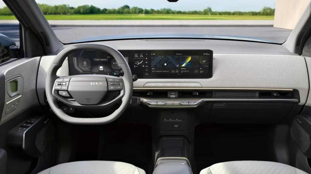 El habitáculo es una lección de ergonomía cálida. Jochen Paesen, responsable de interiores, ha buscado que el coche se sienta como un hogar móvil, utilizando materiales reciclados —como redes de pesca — y colores claros. Incluso hay pequeños guiños emocionales, como un «Hello» en el borde de las puertas o un «Have a nice day» en los tiradores.