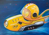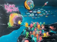 Ese legado del mundo del motor reaparece con claridad en una de sus series más singulares, Punky Aliens. En ella, Agulló regresa a la figuración y articula un universo narrativo poblado por criaturas híbridas, entrañables y aparentemente lúdicas, que habitan escenarios donde el espacio exterior, las profundidades marinas y el imaginario tecnológico conviven con naturalidad.
