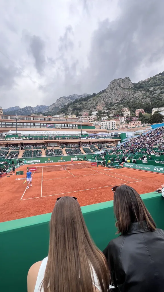 La mañana siguiente amaneció gris, con nubes bajas y ese aire fresco y húmedo del mar que todo lo envuelve. No fue el típico día soleado del sur de Francia, pero eso no empañó en absoluto el broche final: el Masters 1000 de Monte Carlo. Maserati brillaba también aquí como patrocinador oficial, con coches vinilados para la ocasión presidiendo la entrada. Desde nuestra zona VIP vimos los partidos a pie de pista. Las bolas rebotaban a escasos metros de nosotros.