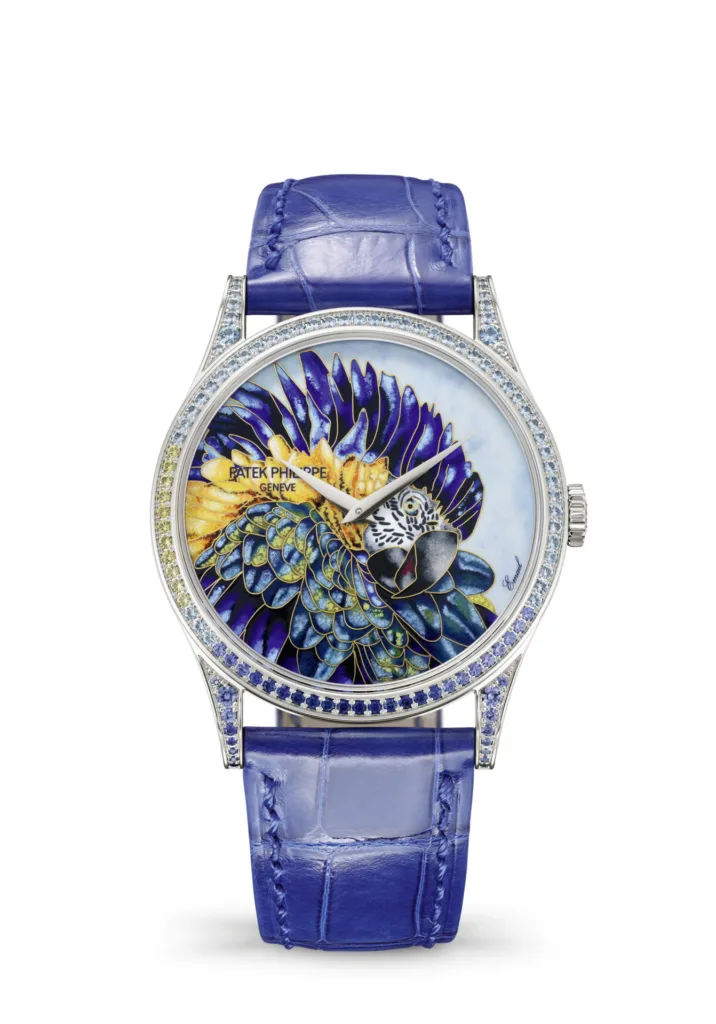 Calatrava engastado con piedras preciosas que evocan la paleta de colores de la esfera en esmalte cloisonné. Engaste de 70 topacios azules, 50 zafiros azules, 11 zafiros amarillos y 10 diamantes.