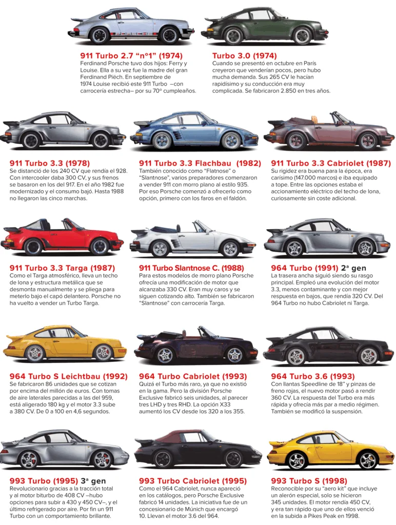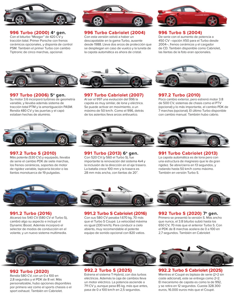 El 911 Turbo siempre ha estado a la vanguardia en cuanto a sistemas de turboalimentación para sus motores seis cilindros bóxer. El primer biturbo fue el 993, el 996 era refrigerado por agua y con distribución variable. El 997 estrenó turbos de geometría variable y el 992, turbos VTG. Ahora los turbos eléctricos son el futuro.