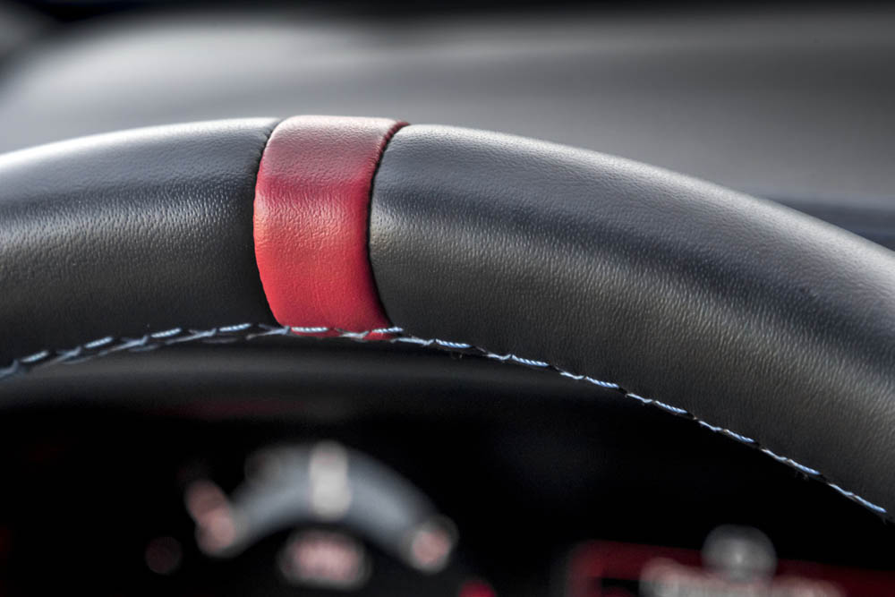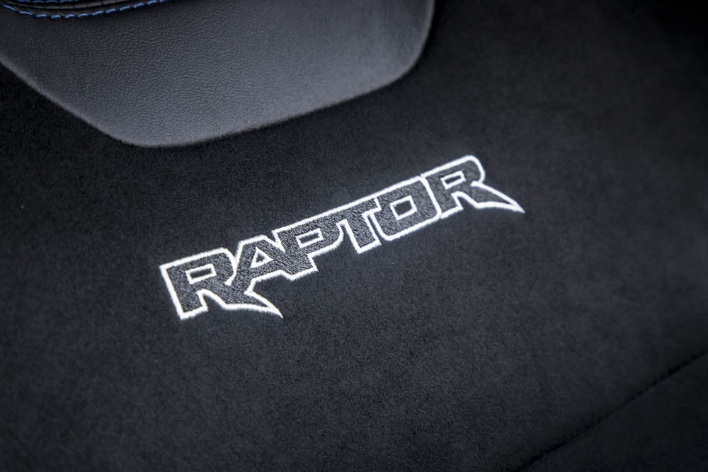 Es bruto por fuera pero muy acogedor por dentro. Tenemos las clásicas agarraderas en los pilares A para subir y bajar del coche, así como agarrarte cuando vengan baches y no conduzcas, y ciertos detalles propios de un Raptor. Como por ejemplo el volante de cuero perforado con costuras azules y la marca roja a las 12 en punto, asientos deportivos en cuero y microfibra con el logo Raptor en la espalda y reglaje eléctrico, una palanca de cambios también cuero y con costuras azules, las cuales también están en su salpicadero, y ciertos apliques y molduras en color gris, así como levas deportivas en el volante.