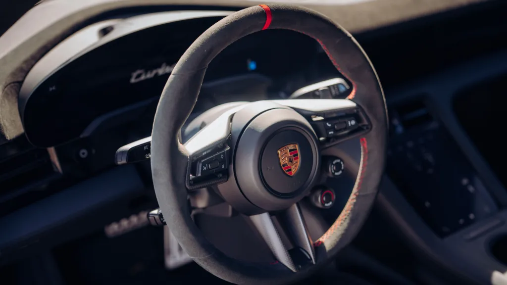 Uno de los detalles más técnicos es el uso de cubrebujes con código de colores, inspirado en las monotuercas de los coches de carreras. En pista, este sistema permite identificar rápidamente cada rueda durante las paradas en boxes. En este Taycan, se convierte en un guiño directo a la operativa real de competición.