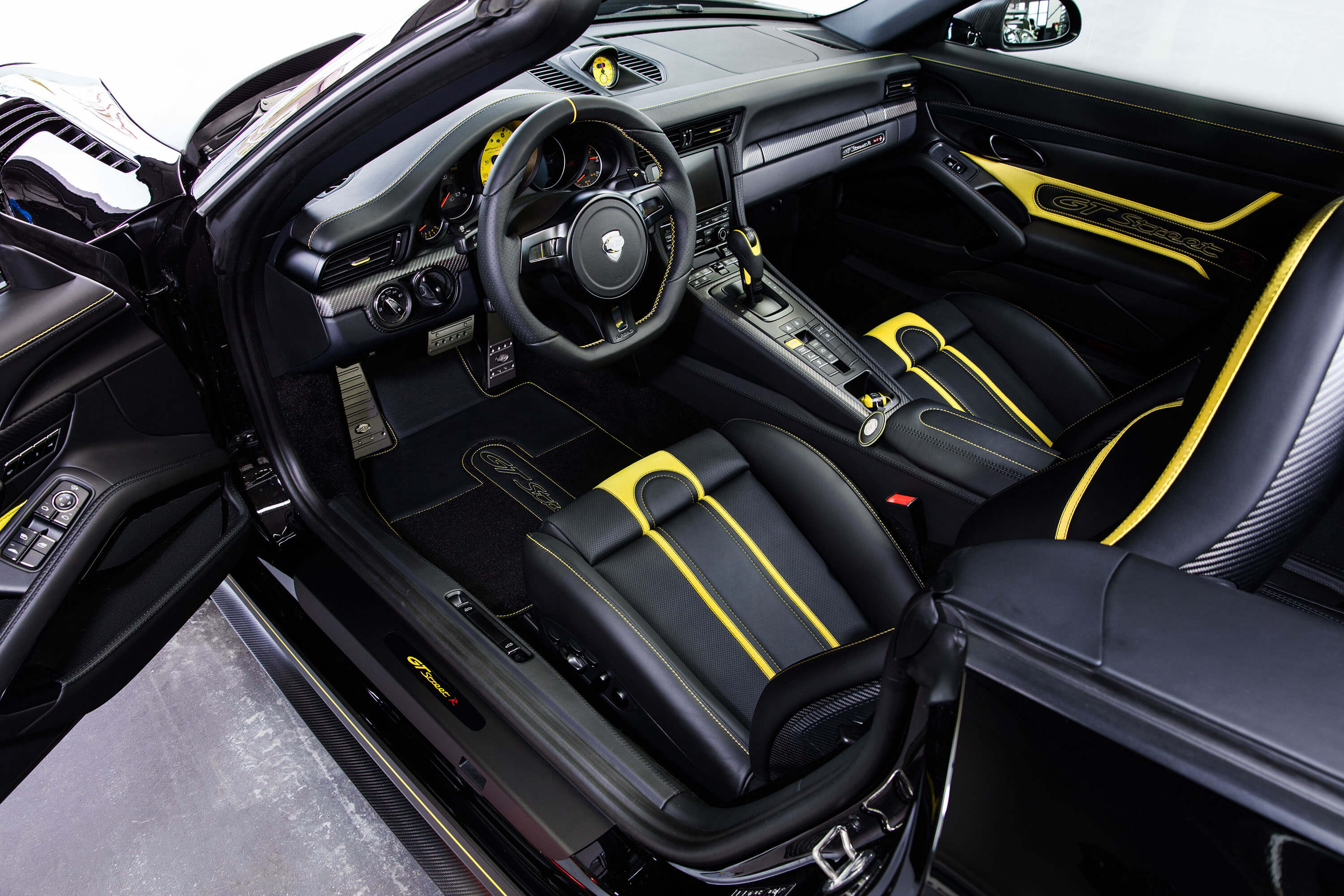 ¿Y qué hay de su interior? Sin duda querrás tener todo el día la capota plegada para que se vea bien. En el TechArt GTstreet R Cabriolet se ha cuidado un habitáculo a imagen y semejanza de su imponente exterior, empleando Alcantara para la tapicería y los paneles de las puertas, además del salpicadero, el techo plegable y los pilares de las puertas. El selector de modos en el volante, las tomas de aire del cimatizador, el selector de marchas PDK y los botones de ajuste del asiento se pueden elegir en el color que se quiera. Además se pueden elegir múltiples elementos en fibra de carbono.