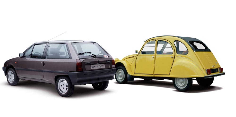 Los primeros prototipos del 2 CV son de antes de la guerra, pero el modelo se lanzó en 1948, con su motor bicilíndrico refrigerado por aire. Estaba tan bien diseñado que recibió pocos cambios hasta su final en 1990. El AX de 1986 reinterpretó con éxito las ideas de ligereza y sencillez del 2 CV, se vendió muy bien y era divertido de conducir.